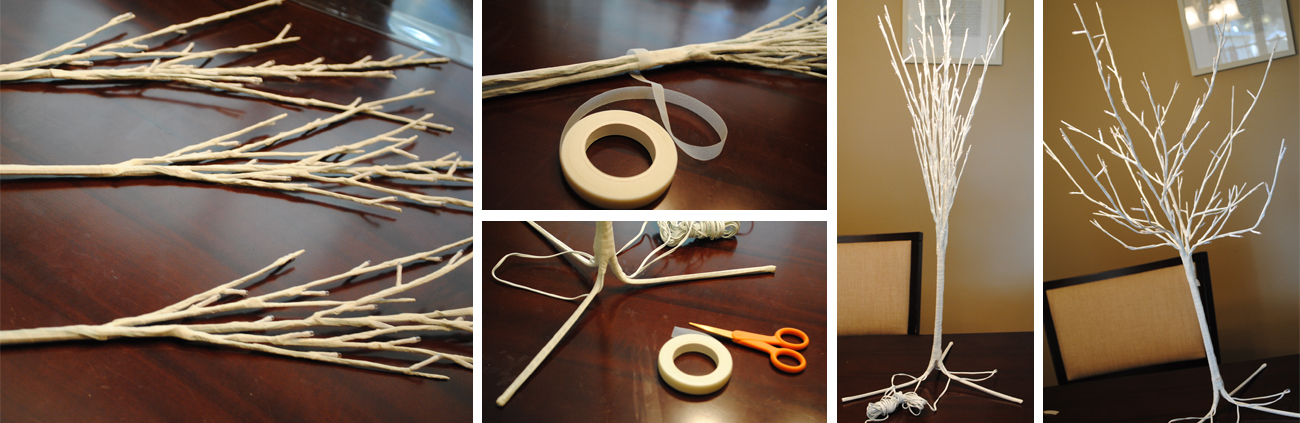 Take the three branches and tape them together with white floral tape. Bend the ends up at the bottom to make the them stand. Bend out the tops of the branches to make it look like a tree. Simple as that!