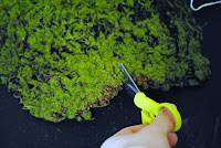 Now comes the fun part.. decorating! I used a sheet of fake moss and cut to the center to wrap around the base of the tree and hide the wires.