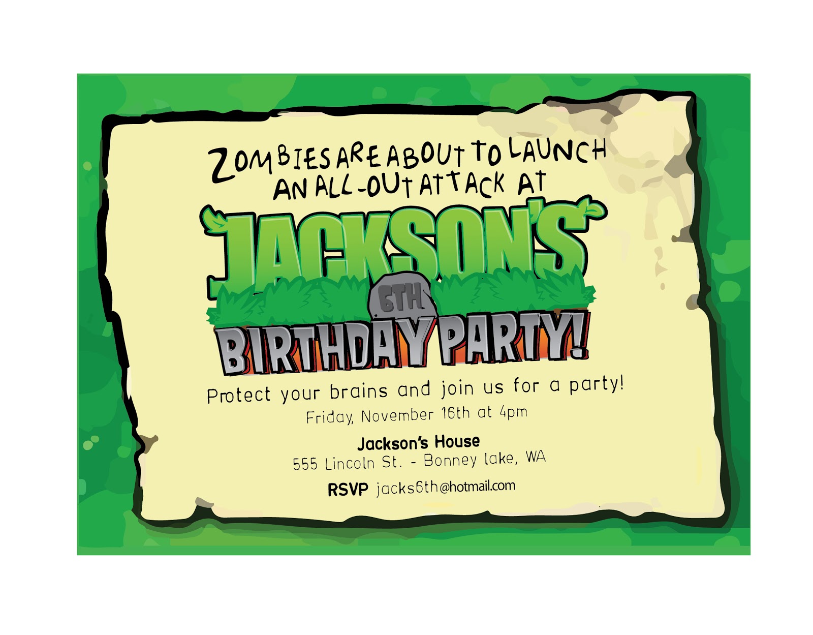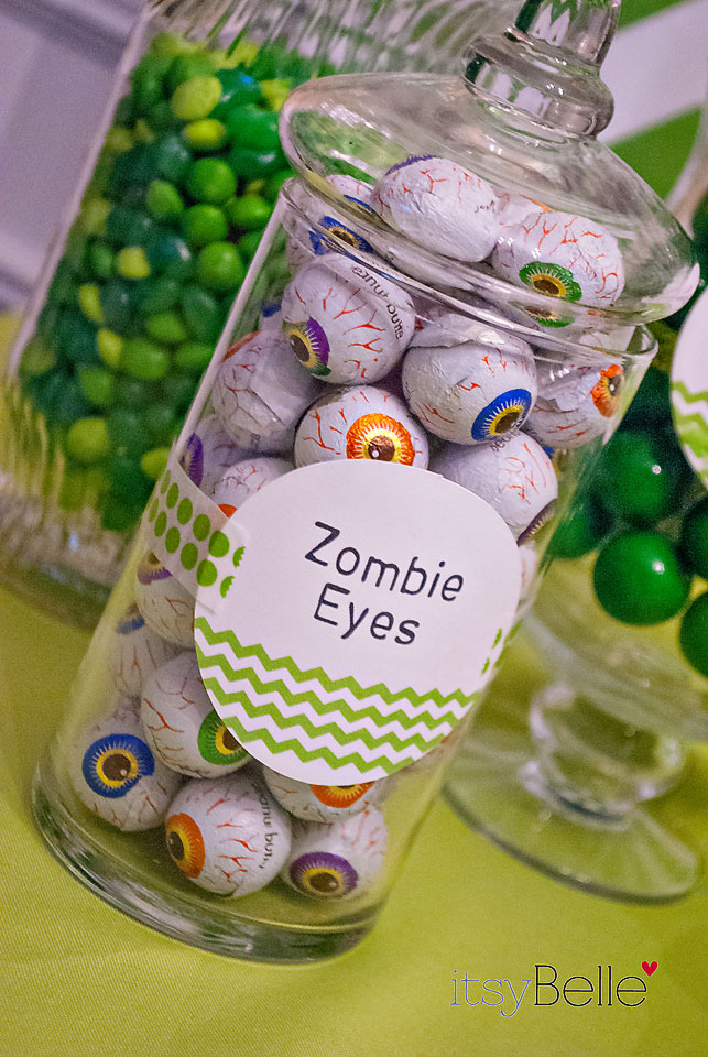 Each guest was sent home with Thank You pack of “Peashooter Peas” (Green Skittles) to shoot at Zombies to “Protect Your Brains!”
