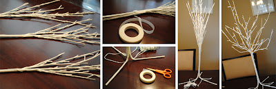 Take the three branches and tape them together with white floral tape. Bend the ends up at the bottom to make the them stand. Bend out the tops of the branches to make it look like a tree.  Simple as that!
